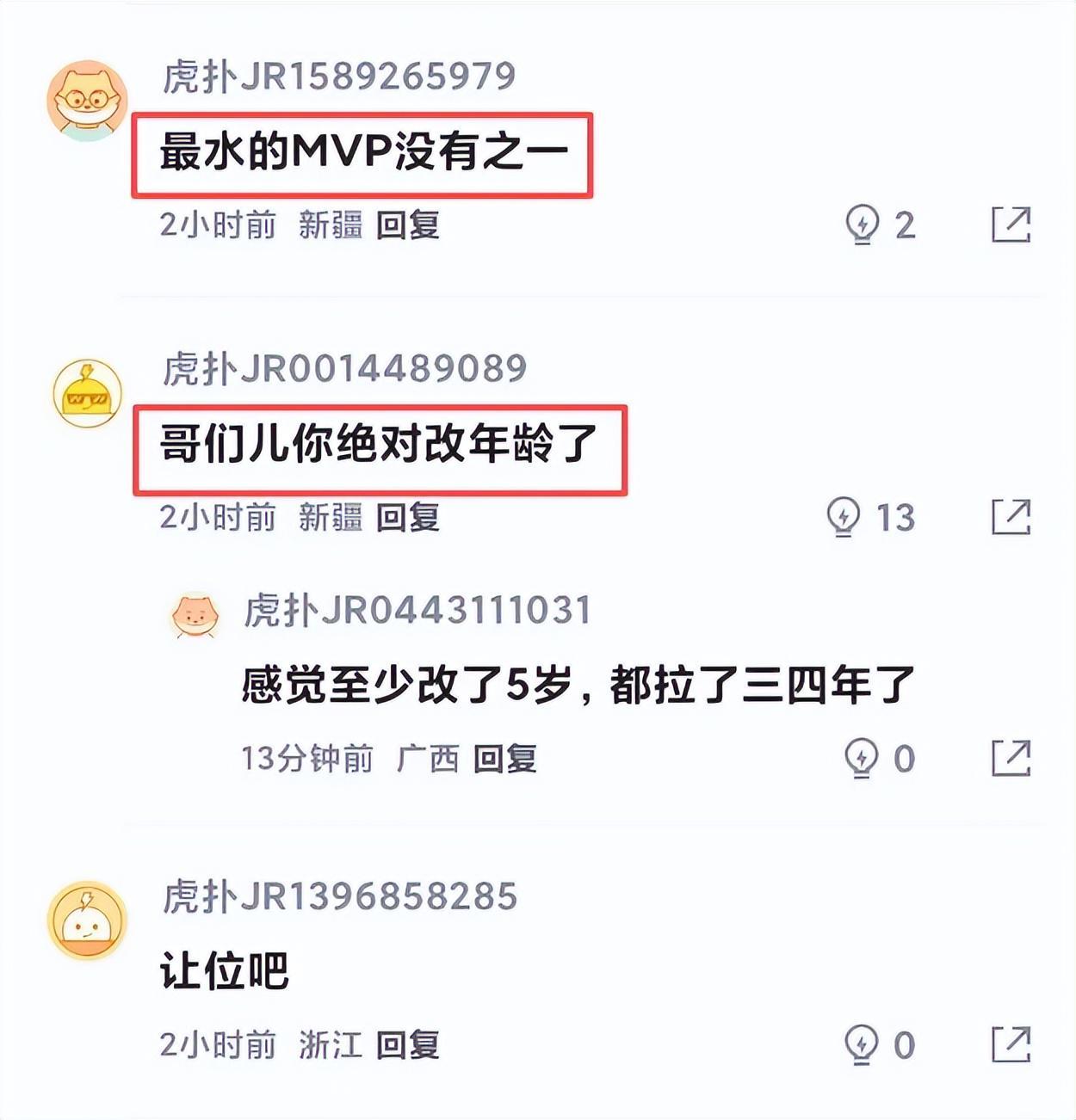 也正因如此,在本场赛后,不少球迷纷纷吐槽:“哥们儿你绝对改年龄了”、“经典18岁打上CBA,31、32岁tm快退役了”、“最水的MVP没有之一”、“真的退役吧,防不住打不进就别浪费别人的机会了”、“一如既往的稳定,上来球队就输分”......