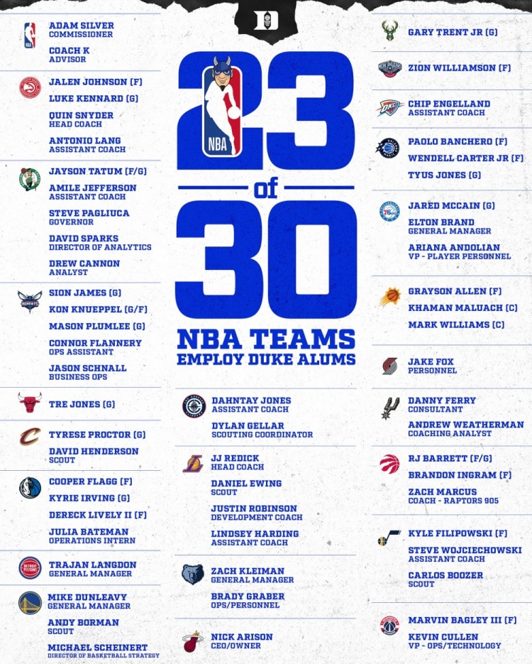 本赛季NBA球队的杜克系球员或雇员